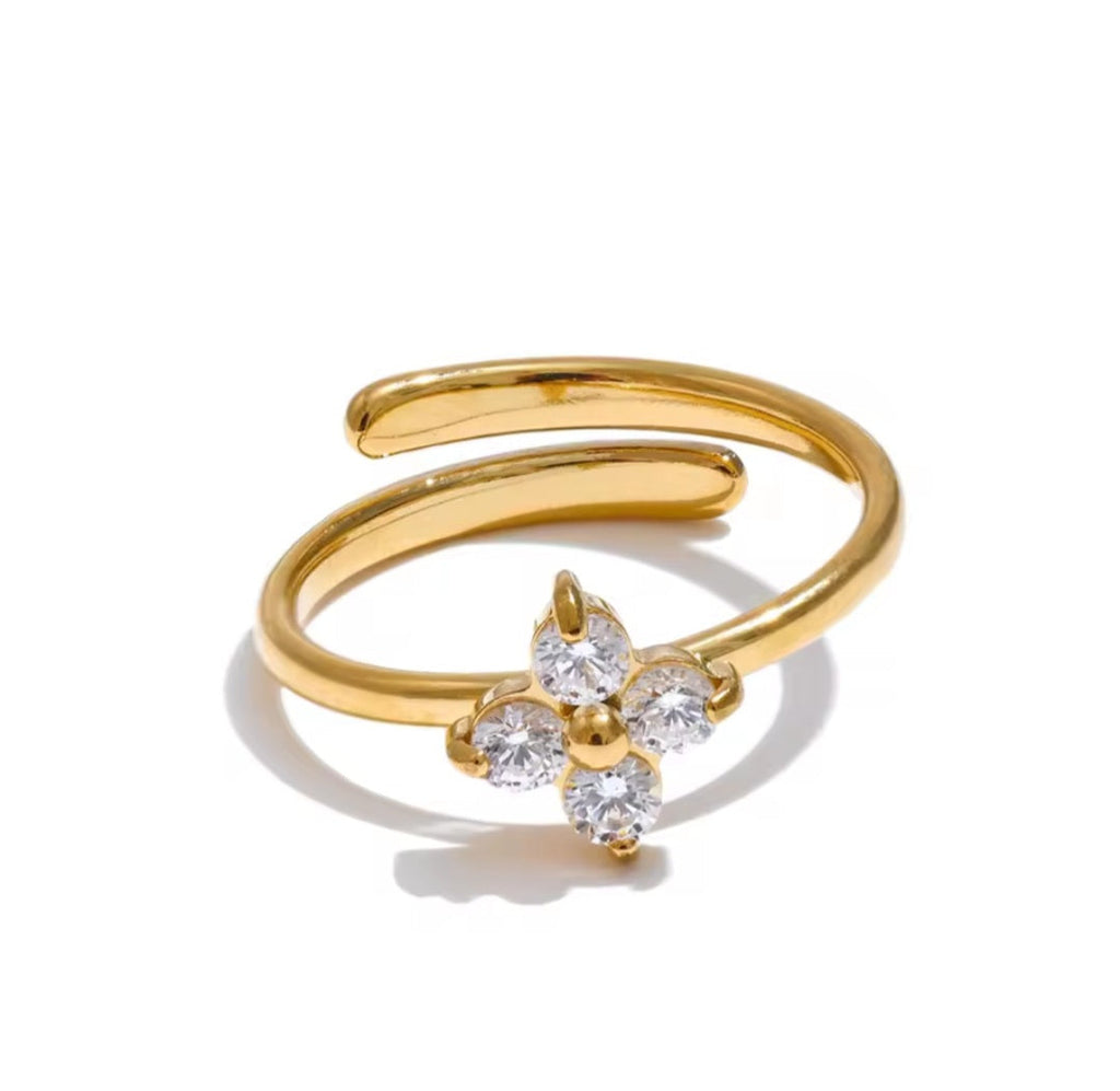 A delicate four-petaled floral design set with radiant cubic zirconia stones. This adjustable ring pairs beautifully with the Eden Necklace and Eden Bracelet for a complete, feminine ensemble.