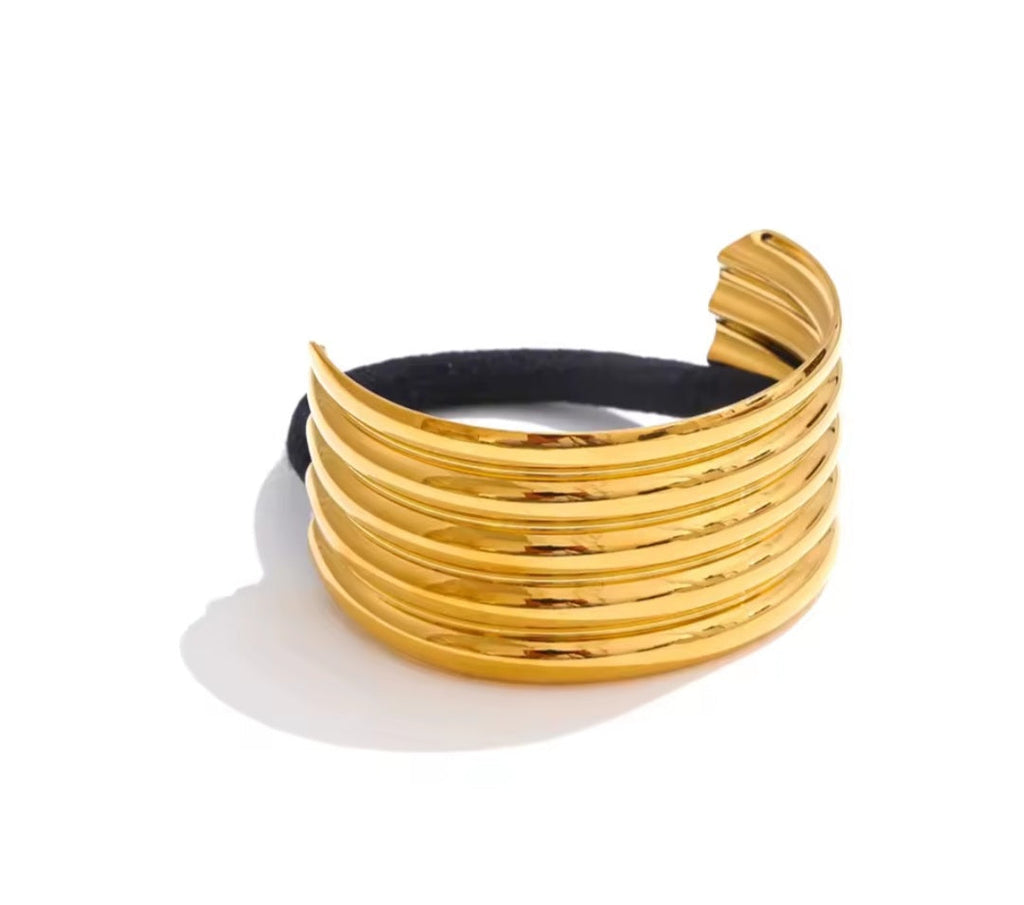 A five-ring gold band disguises the hair tie beneath, creating a sleek, elevated accessory. Quiet luxury for your hair. Stainless steel detailing • Long-lasting